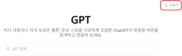GPT 검색 창이 나타나는데 오른쪽 상단 “만들기”를 클릭합니다. “Chat GPT Plus”를 구독해야 다음 단계로 넘어갈 수 있습니다.