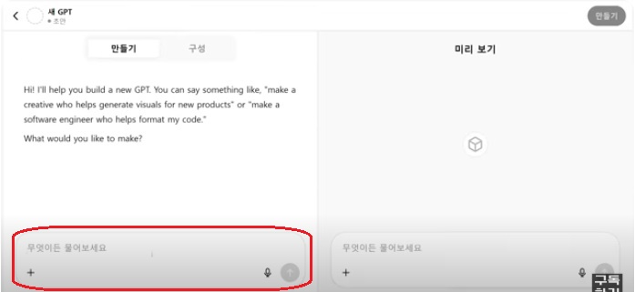 왼쪽 창에서 “만들기”를 클릭하면 채팅 형식으로 AI 챗봇을 만들 수 있습니다.