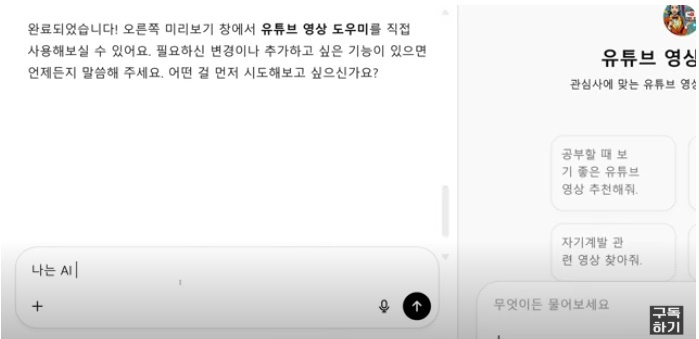 “완료되었습니다!” 메시지가 뜨는데 변경이나 추가하고 싶은 기능을 입력해서 업그레이드할 수 있습니다. “AI 관련 영상을 많이 추천해 줘”, “말투는 친근하게” 등의 지침을 입력하면 됩니다.