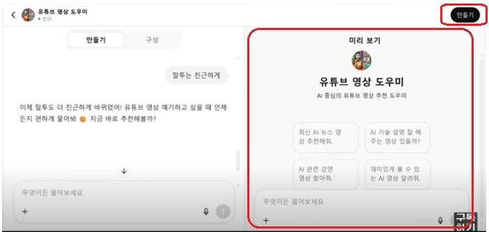 오른쪽 미리 보기 창에서 만들어진 AI 챗봇을 확인할 수 있습니다. 오른쪽 상단의 “만들기”를 클릭하면 아래와 같은 창이 뜹니다.