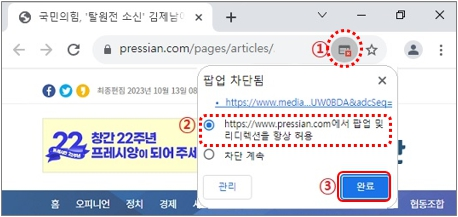 첫 번째는 주소 표시줄 우측에 나타나는 아이콘을 클릭하여 현재 접속 중인 사이트만 즉시 허용하는 간편한 방법인데요. 차단된 상태에서 주소창 끝의 작은 아이콘을 누른 뒤 ‘팝업 및 리디렉션 허용’을 선택하고 완료 버튼을 클릭하면 해당 페이지의 창이 정상적으로 열립니다.