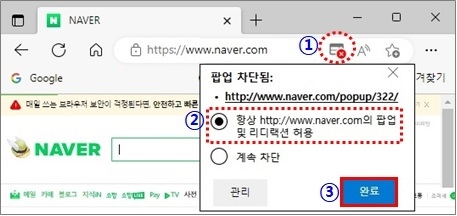 엣지를 사용하는 사람들은 주소 표시줄에 나타나는 빨간색 표시등 형태의 아이콘을 눌러 현재 페이지의 제한을 즉각적으로 풀 수 있는데요. 팝업 차단 아이콘이 보일 때 이를 클릭하고 허용 문구에 체크한 뒤 완료를 누르면 실시간으로 차단되었던 창들이 쏟아져 나오게 됩니다.