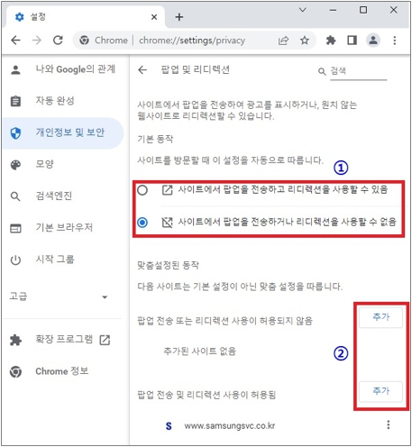 해당 화면에서 하단으로 스크롤을 내리다 보면 ‘팝업 및 리디렉션’ 항목이 나타나는데 여기서 토글 스위치를 통해 전체 허용 여부를 결정할 수 있습니다. ‘차단(권장)’ 스위치가 켜진 상태라면 모든 팝업이 막히고 꺼진 상태라면 모든 창이 허용되는 구조이므로 본인의 사용 목적에 맞게 조정을 하시기 바랍니다.