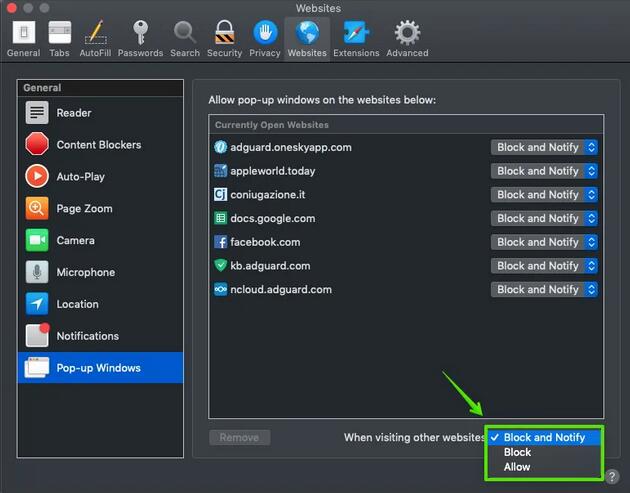 - 하단을 보면 ‘다른 웹 사이트 방문 시’라는 드롭다운 메뉴가 있는데 그 기본 값이 ‘차단 및 통보‘로 설정되어 있을 겁니다.