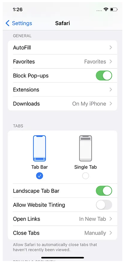 화면을 아래로 스크롤 하다보면 ‘Safari’ 메뉴가 나타나는데, 그 안에서 다양한 브라우저 옵션을 확인할 수 있습니다. 개중 ‘팝업 차단’이라는 항목이 있는데 이 옆에 초록색 토글 스위치를 회색으로 바꾸면 팝업 차단이 해제됩니다.